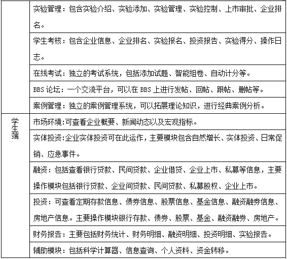 投融(rong)(rong)資(zi)決(jue)策實驗是由學生扮演各種企(qi)業(ye),教師給定(ding)企(qi)業(ye)的初始資(zi)金,分(fen)為固(gu)定(ding)資(zi)產和流動(dong)資(zi)金兩部分(fen),學生可以合理分(fen)配流動(dong)資(zi)金,利用銀行(xing)存款(kuan)、銀行(xing)貸款(kuan)、債(zhai)券、股票、基金、融(rong)(rong)資(zi)融(rong)(rong)券、房地產、企(qi)業(ye)間貸款(kuan)、民(min)間貸款(kuan)、私募(mu)股權(quan)、企(qi)業(ye)上市等投融(rong)(rong)資(zi)手段,積累實體投資(zi)資(zi)金。