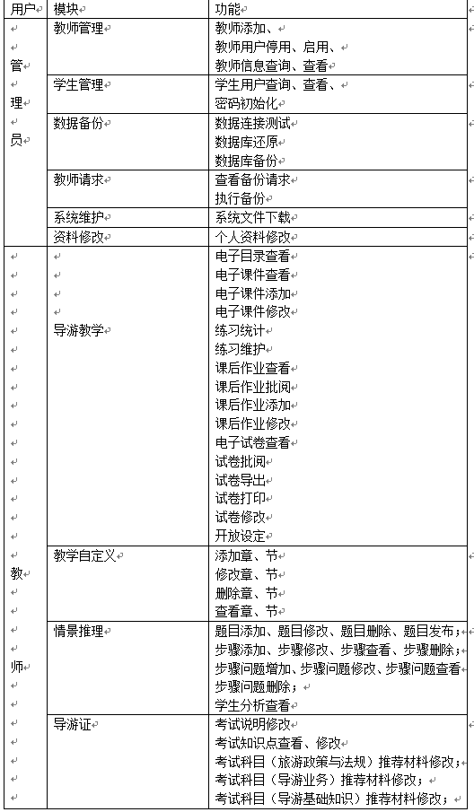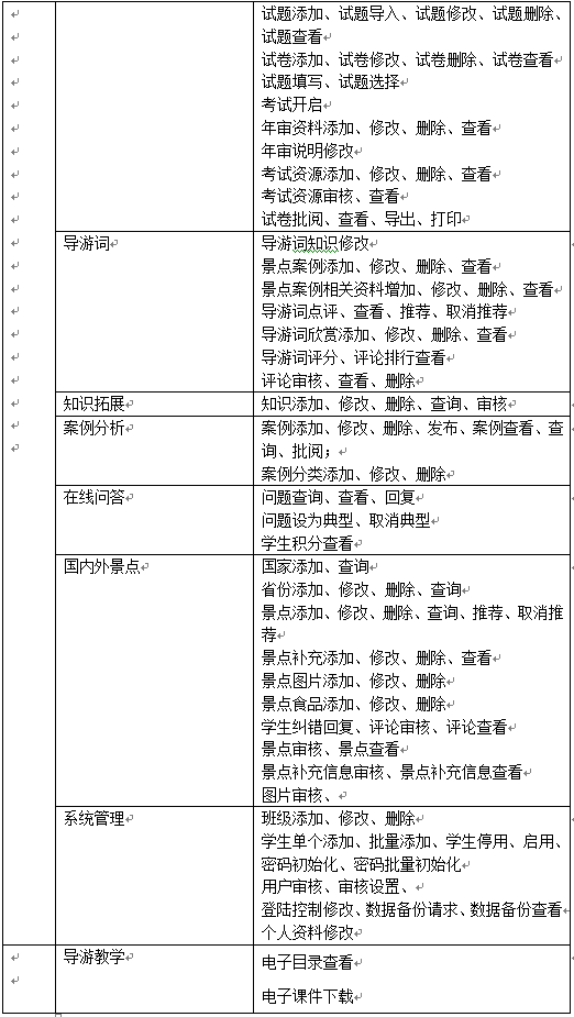 教師(shi)主要(yao)功能包括班級(ji)學生管(guan)(guan)(guan)理(li)(li)、導游(you)基礎知識(shi)(shi)管(guan)(guan)(guan)理(li)(li)、國(guo)內(nei)導游(you)知識(shi)(shi)管(guan)(guan)(guan)理(li)(li)、國(guo)外導游(you)知識(shi)(shi)管(guan)(guan)(guan)理(li)(li)、情景(jing)題(ti)目(mu)管(guan)(guan)(guan)理(li)(li)、導游(you)證考試(shi)資料管(guan)(guan)(guan)理(li)(li)、模擬考試(shi)、導游(you)詞管(guan)(guan)(guan)理(li)(li)、導游(you)案(an)例管(guan)(guan)(guan)理(li)(li)、知識(shi)(shi)拓展、案(an)例分析管(guan)(guan)(guan)理(li)(li)、在線問答(da)、國(guo)內(nei)外景(jing)點信(xin)息管(guan)(guan)(guan)理(li)(li)等。