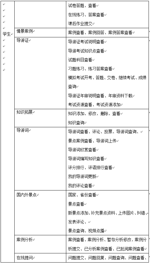 學(xue)(xue)(xue)(xue)生的(de)主要功能是導游(you)教學(xue)(xue)(xue)(xue)知(zhi)(zhi)識的(de)學(xue)(xue)(xue)(xue)習、完成(cheng)情景(jing)推理中包含(han)的(de)案例及題目、導游(you)證考(kao)試學(xue)(xue)(xue)(xue)習及模擬考(kao)試、導游(you)拓展知(zhi)(zhi)識學(xue)(xue)(xue)(xue)習,同(tong)時可(ke)添(tian)加新的(de)知(zhi)(zhi)識供其他同(tong)學(xue)(xue)(xue)(xue)學(xue)(xue)(xue)(xue)習、導游(you)詞學(xue)(xue)(xue)(xue)習并編寫導游(you)詞、國內外景(jing)點學(xue)(xue)(xue)(xue)習、案例分析和在線提問(wen)。