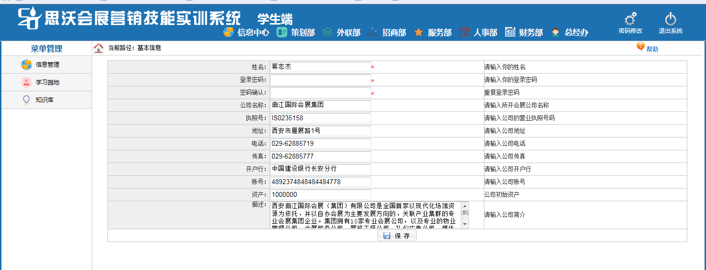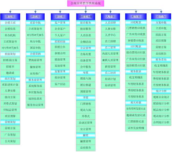 思沃會(hui)展(zhan)(zhan)營銷模擬(ni)實訓系(xi)(xi)統以(yi)模擬(ni)會(hui)展(zhan)(zhan)公司的(de)(de)策劃部、外聯(lian)部、招商(shang)部、會(hui)展(zhan)(zhan)服(fu)務(wu)部、人事部、財務(wu)部以(yi)及總經辦7大業(ye)務(wu)部門為基礎(chu)而展(zhan)(zhan)開實驗操作(zuo)(zuo)的(de)(de)。該教學(xue)(xue)平(ping)臺軟件業(ye)務(wu)內(nei)容包(bao)括了(le)(le):項(xiang)目(mu)上(shang)報審批(pi)、項(xiang)目(mu)的(de)(de)策劃安排、服(fu)務(wu)商(shang)管理(li)、人事招聘(pin)與管理(li)、會(hui)展(zhan)(zhan)的(de)(de)現(xian)場(chang)服(fu)務(wu)與合同管理(li)等等,讓學(xue)(xue)生(sheng)通(tong)過實驗感受會(hui)展(zhan)(zhan)項(xiang)目(mu)的(de)(de)系(xi)(xi)統化管理(li)流程與業(ye)務(wu)操作(zuo)(zuo)內(nei)容,不但能夠了(le)(le)解會(hui)展(zhan)(zhan)項(xiang)目(mu)從立項(xiang)審批(pi)到策劃、宣傳(chuan)、招展(zhan)(zhan)招商(shang)、現(xian)場(chang)服(fu)務(wu)以(yi)及會(hui)后(hou)(hou)總結各(ge)個(ge)(ge)環(huan)節的(de)(de)業(ye)務(wu),同時還可以(yi)掌(zhang)握(wo)各(ge)種文(wen)案(an)的(de)(de)寫作(zuo)(zuo)技巧,從而讓學(xue)(xue)生(sheng)真正(zheng)的(de)(de)理(li)解并掌(zhang)握(wo)會(hui)展(zhan)(zhan)這一行(xing)業(ye)的(de)(de)各(ge)種知識(shi)與業(ye)務(wu)要求。為學(xue)(xue)生(sheng)以(yi)后(hou)(hou)的(de)(de)工作(zuo)(zuo)、學(xue)(xue)習提供了(le)(le)一個(ge)(ge)實戰演練的(de)(de)實訓平(ping)臺,增(zeng)強了(le)(le)學(xue)(xue)生(sheng)進入工作(zuo)(zuo)崗位后(hou)(hou)的(de)(de)實力。