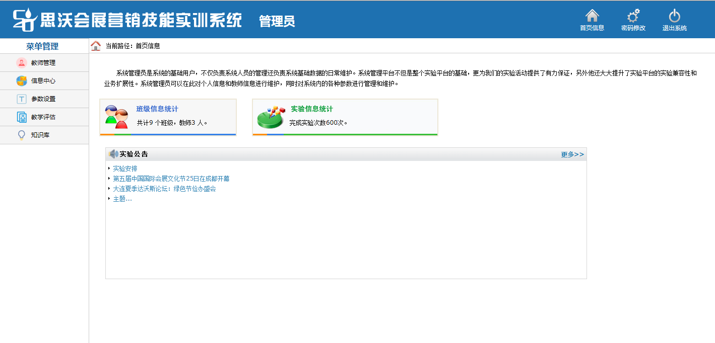 管理員包含(教室管理,信(xin)息(xi)中心(xin),參數設置(zhi),教學評估,知識庫(ku)等模塊)